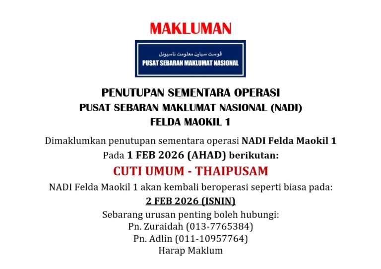 JOM SERTAI PROGRAM NADI MAHIR – INTAKE KE-3! 🌟 Salam semua 👋 📢 Pendaftaran Intake 3 Program Mahir akan dibuka bermula 22 Disember 2025 (Isnin) 📍 Peserta yang berminat, sila kunjungi NADI Felda Maokil 1 untuk mendaftar.🌟Mahir Masak🌟Mahir Baiki Gajet🌟Mahir […]